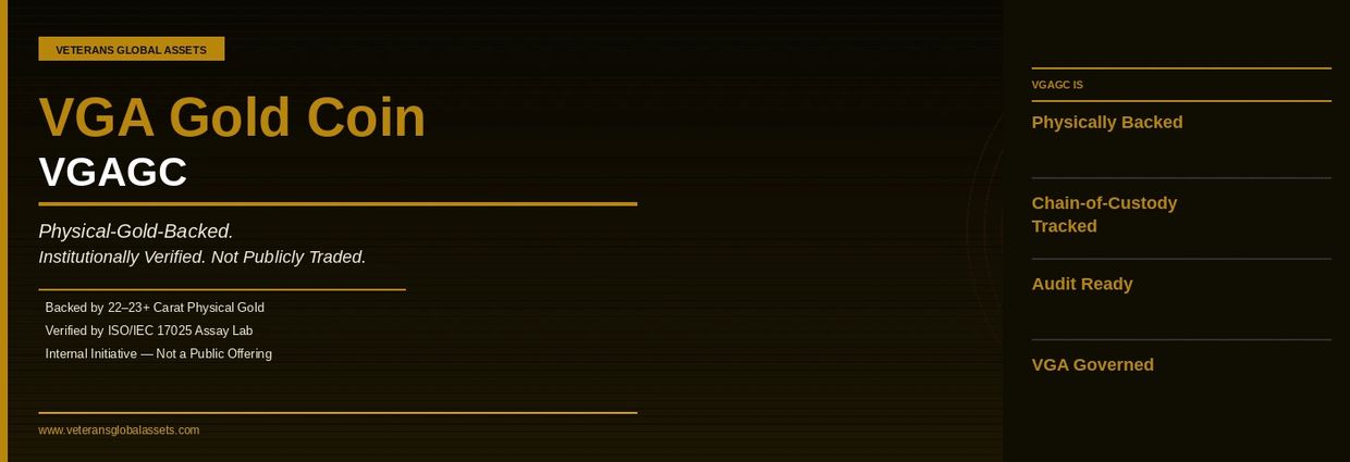 The VGA Gold Coin (VGAGC) is an internal strategic initiative of Veterans Global Assets, aligned directly with VGA's physical gold production and reserve holdings. VGAGC is not a public offering. It is not traded on consumer exchanges. It is not marketed to retail investors.